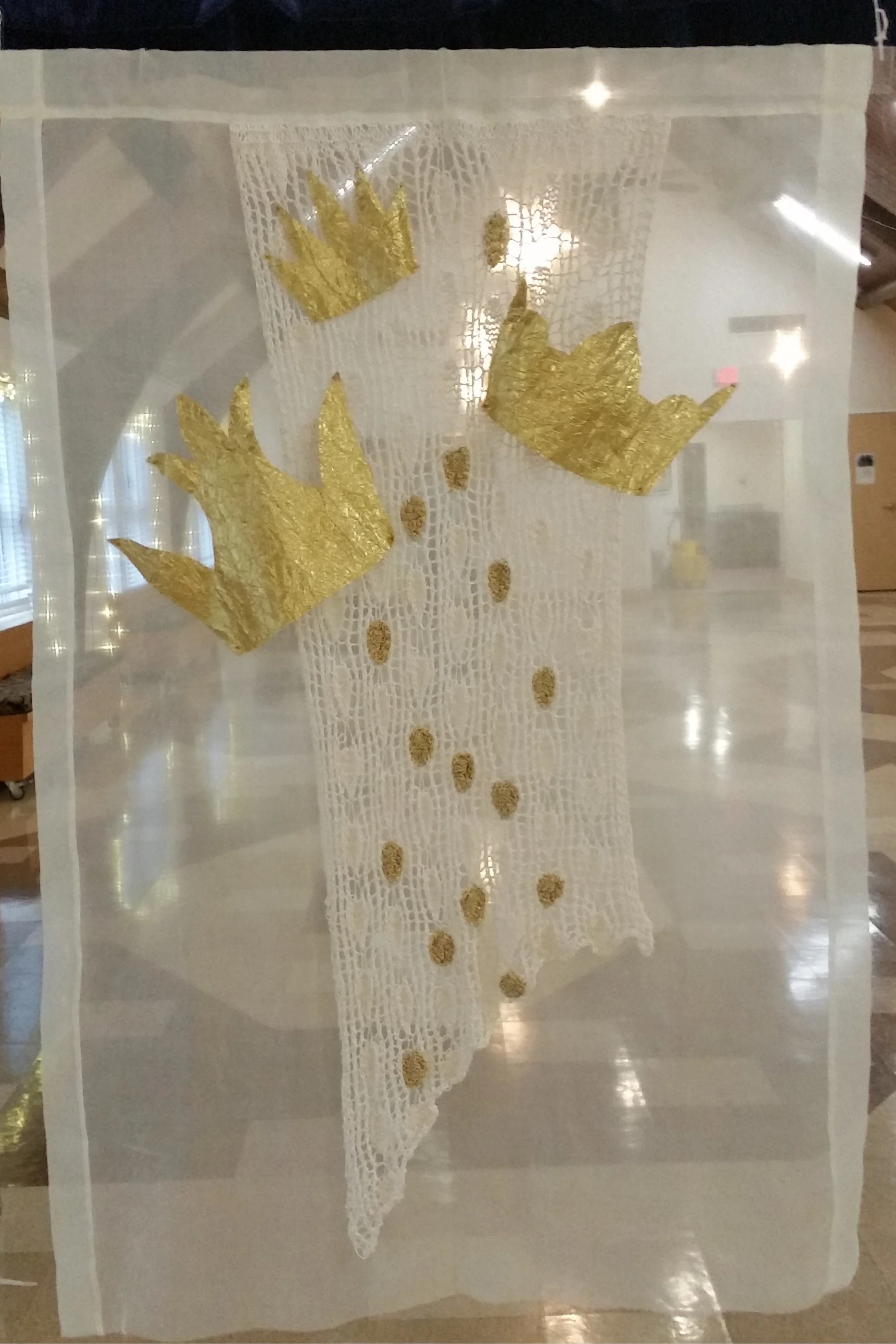 The second banner represents the coming of the Three Magi to the baby Jesus, with their gifts of gold, frankincense and myrrh. The three gold crowns are of a lightweight, shimmery gold fabric known as lamé. The knitted piece is a pattern in which Donna knit some of the circular parts with metallic gold yarn to represent gold coins made from the gold which the Wise Men brought.