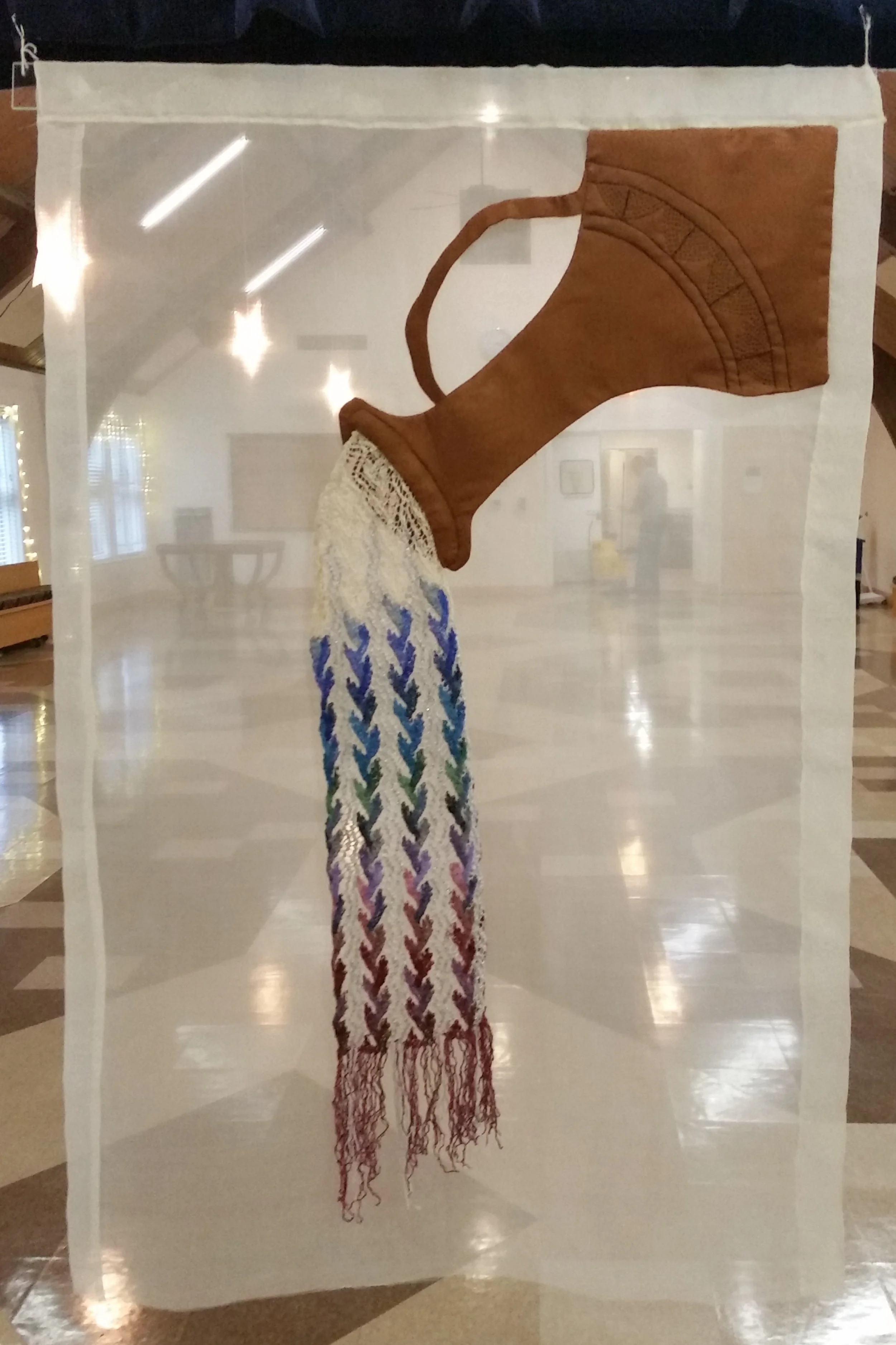 The fourth and final banner depicts the First Miracle of Jesus at the Wedding of Cana, when he turned water into wine. The quilted jug is pouring out the water, and as the colors change in the lovely knitted piece, one can see the water turning into wine.