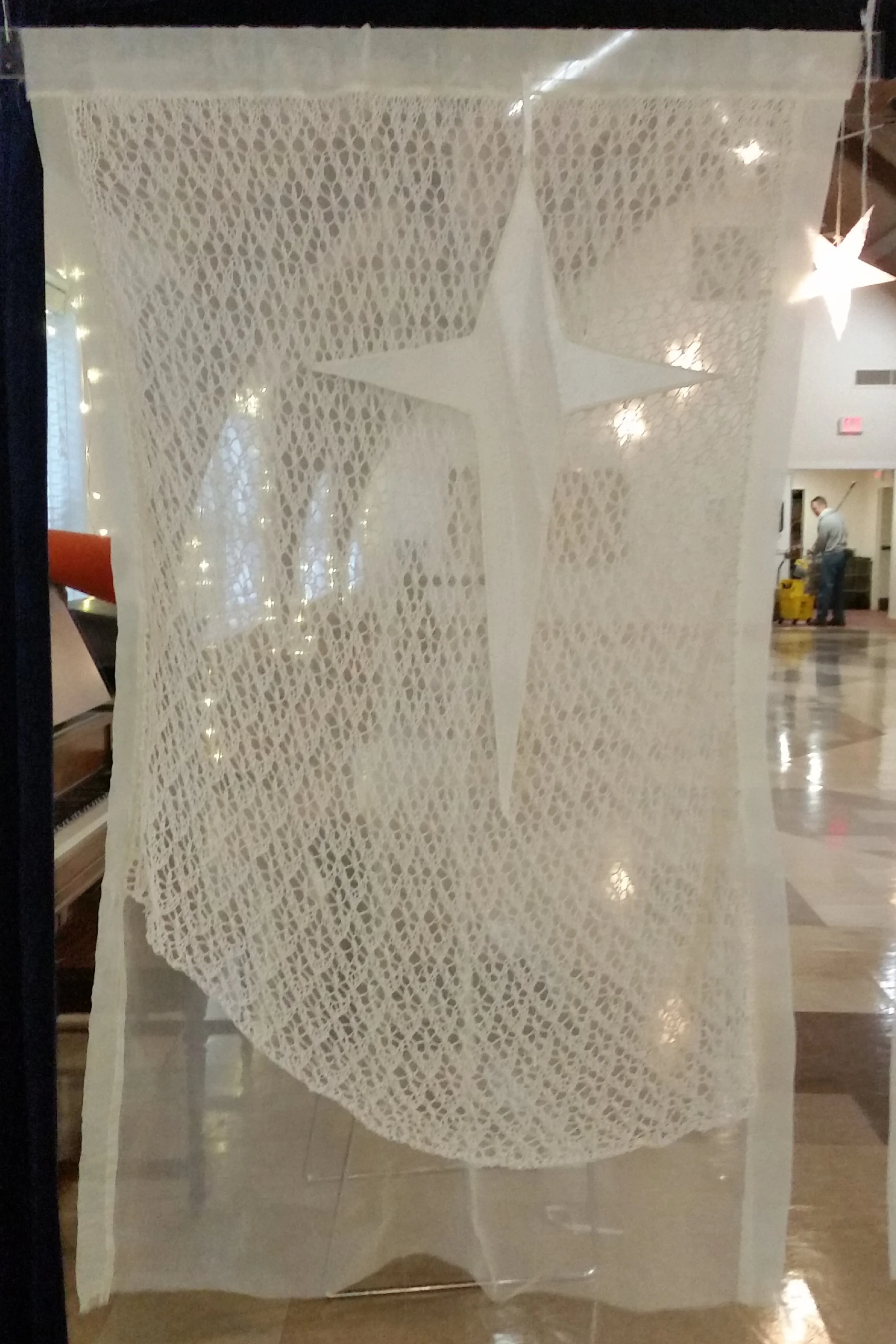 So began a two-year process. Beginning in January of 2015, the three artists started work on the project. Carolyn drew the design concepts on paper, and, with Donna and Lynda, began to envision how to translate the drawings into organza, knitting, and quilted elements. They did extensive research to see if anyone had combined these elements before, but were unable to find anything similar to what they envisioned. They would indeed be breaking new ground in fabric art by combining such disparate materials. 2015 was a year of trial and error and discovery, with the execution of the banners beginning in 2016.